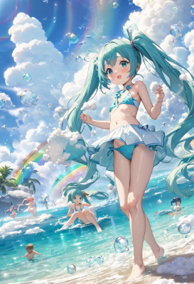 masterpiece, best quality, extremely detailed, anime, girl, skirt, Hatsune Miku, Snow Miku, blue-green twintails, girl playing in the water at a beach on a tropical island, bikini swimsuit Hatsune Miku, clear blue sea and sky, cumulonimbus clouds, fantastical, soap bubbles, rainbow, child, smiling.