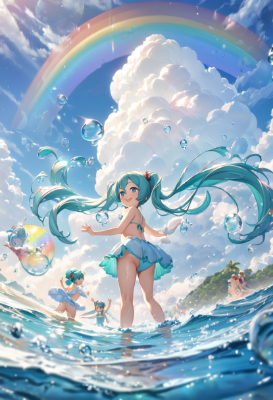 masterpiece, best quality, extremely detailed, anime, girl, skirt, Hatsune Miku, Snow Miku, blue-green twintails, girl playing in the water at a beach on a tropical island, bikini swimsuit Hatsune Miku, clear blue sea and sky, cumulonimbus clouds, fantastical, soap bubbles, rainbow, child, smiling.