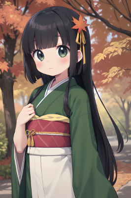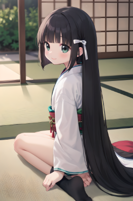 1 girl,(((very longest hair))),black hair, ,straight Hair,hair ribbon,mintgreen stripe,Black Eyes,flat chest,straight Across bangs,princess Cut, Very Long Sideburn,roundry Head,Droping eyes,cute,Meekness,Bob Cut,long back hair,12 years Old, smile,kimono,reading book,encyclopedia