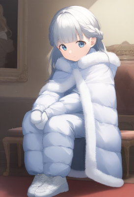 {{{{{down jacket, snowsuit, long stitched padded puffy pants, big long fluffy fur-trimmed cape}}}}}, {{{heavy clothes, fur-trimmed sleeves, fur-trimmed cuffs, fur-trimmed hood, oversized clothes, shiny clothes}}}, [latex], cute girl, solo, sneakers, contrapposto, [[[[[[[[[[gochuumon wa usagi desu ka?]]]]]]]]]], mittens, {{{{{indoors, walking, looking to the side, crowd, museum, statue, sculpture}}}}}, {{{beige hair}}}, gray eyes, yellow jacket, yellow pants, {{{medium hair}}}, two side up, , best quality, amazing quality, very aesthetic, absurdres