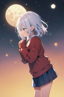 fine line, traditional media, (light watercolor:1.3), depicted with great detail and precision on aged paper., 1girl, reading book, night room, moon,happy smile, hand up, hair tucking, hand in hair, adjusting hair,
