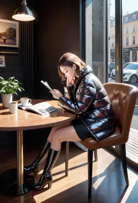 (photorealistic:1.4), (RAW photo), masterpiece, best quality, extremely detailed, lady, neat and clean, elegant, dark brown hair, almond shaped eyes, smile, (shiny, glossy:1.1), blue down jacket, (sailor collar:1.1), pleated skirt, knee high boots, ribbon bow tie, reading, sitting, chair
