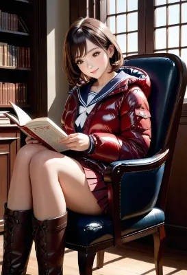 (photorealistic:1.4), (RAW photo), masterpiece, best quality, extremely detailed, lady, neat and clean, elegant, active, almond shaped eyes, smile, shiny, glossy, closed zipper, shiny down jacket, (sailor collar:1.2), (pleated micro mini skirt:1.2), (enamel pants:1.1), enamel boots, ribbon bow tie, park, schoolyard, school building
