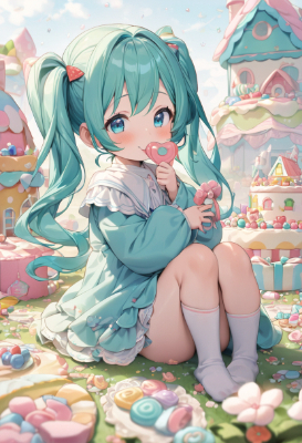 masterpiece, best quality, extremely detailed, anime, girl, skirtHatsune Miku, VOCALOID, girl, my child, child, blue-green twin tails, girl licking candy with a cute smile. Candy house, big cake, candy flower field,twintail,longhair,blue hair,green hair,blue eyes,socks,fairy,fantasy