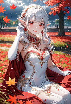 8K,((masterpiece,best quality,Ultra extremely detailed,perfect anatomy,detailed,high-resolution,highres,extremely detailed)),((close-up hand,Flowers print,child elf wearing glossy jewelry decoration parl-red thin-cloth-suit with sparkle reflected light, sitting,wearing white-sox, see-through white gloves, see-through white boots )),looking at viewer, red Eyes, Reflections reflect strong highlight in eyes,waving shining long white hair_with curly,red Eye,elf ear with big earrings,opened_mouth:1.5,smile,blush,lipstick,full fresh lips,wet_lip,big hip,small breasts,BREAK,4K,plaza in grasses,many maple leaves,maple tree,dark clouds sunrise,birds,<lora:hairdetailer:1> <lora:make25d_type1_v100:1>,