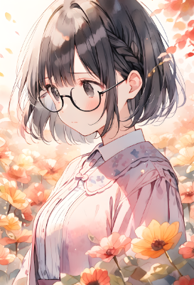 kawaii, pastel colour, soft light, watercolor, one girl, solo, black hair, black eyes, bob cut, wearing glasses, Braids, silky outfit, countless Autumn flowers, sadness, upper body,,,