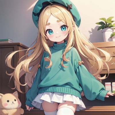 masterpiece,best quality,extremely detailed,1girl,child,infant body type,flat chest,blonde hair,wavy hair,long hair,aqua eyes,thick eyebrows,show_forehead,sweatshirt,miniskirt,kneehighs,cute_shoes,smile,She's drinking tapioca milk tea,sitting_on_chair,inside cafe,upper_body,