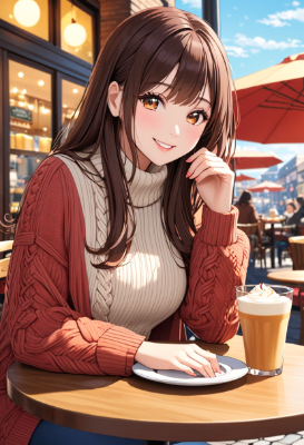 hair,amazing, ((sunnysmaile)), (smiling ),long hair, amazing sapraizz, extremely fine and beautiful design,extremely fine and beautiful colors, ダイナミックな演出, ,((Moe sleeves)) ,day,cafe,clear sky, high resolution, sweater <lora:saturation:1> <lora:make25d_type4_v100:1>