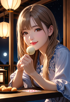 、moonlight,moon (In the veranda), ((card)), Detailed face, Beautiful Eyes, (Good sitting position,Look forward), Small breasts but good style, Light brown straight hair, (Thick lips), ((A kind smile))show,amazing sapraizz, extremelyfineandbeautifulcolors, <lora:saturation:1> <lora:make25d_type4_v100:1>,Moe sleeves