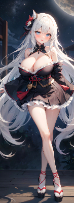 girl, huge breasts, cleavage ,longhair, two side up white hair,blue eyes, tearful, A black leather collar, Place the collar chain between cleavage, off-shoulder Kimono Clothes,frill, frill mini skirt, all fours, on the futon, barefoot, Japanese style room <lora:hohoaka:1>