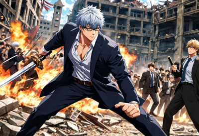 masterpiece, best quality, extremely detailed, anime, 1girl, solo, long hair, gloves, looking at viewer, jewelry, brown hair, ponytail, blue eyes, earrings, standing, cross-laced footwear, full body, hair bow, brown footwear, asymmetrical bangs, forehead, blue bow, blue border shirt, jeans, halo, holding rifle, city, smile, close eyes, open mouth,