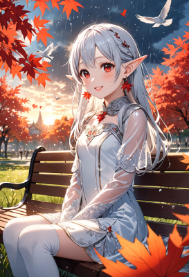 8K,((masterpiece,best quality,Ultra extremely detailed,perfect anatomy,detailed,high-resolution,highres,extremely detailed)),((close-up chest,Flowers print,child elf wearing glossy jewelry decoration red thin-cloth-suit with sparkle reflected light, sitting,wearing white-sox, see-through sleeves,see-through white gloves, see-through white boots )),looking at viewer, red Eyes, Reflections reflect strong highlight in eyes,waving shining long white hair_with curly,red Eye,elf ear with big earrings,opened_mouth:1.5,smile,blush,lipstick,full fresh lips,wet_lip,big hip,small breasts,BREAK,4K,bench,plaza in grasses,many maple leaves,maple tree,dark clouds sunrise,birds,rain,<lora:hairdetailer:1> <lora:make25d_type1_v100:1>,