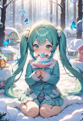 masterpiece, best quality, extremely detailed, anime, girl, skirt,twintail,longhair,blue hair,green hair,blue eyes,colored contact lenses,masterpiece, best quality, extremely detailed, anime, girl, skirt,masterpiece, best quality, extremely detailed, anime, girl, skirt, Hatsune Miku, vocaloid, Snow Miku, fluffy light blue coat and skirt, light , half up, our girl, young girl, cute smile, sunlight filtering through the forest, blue butterflies flying, winter forest, soap bubbles, rainbow, snow, snowflake, fairy, fantastical landscape,blue eyes,twintail,longhair,blue hair,green hair,sitting,masterpiece, best quality, extremely detailed, anime, girl,masterpiece, best quality, extremely detailed, anime, girl, skirtHatsune Miku, VOCALOID, girl, my child, child, blue-green twin tails, girl licking candy with a cute smile. Candy house, big cake, candy flower field,twintail,longhair,blue hair,green hair,blue eyes,socks,fairy,fantasy