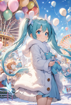 masterpiece, best quality, extremely detailed, anime, girl, skirt,Hatsune Miku, Snow Miku, light blue twin tails, blue eyes, girl, skirt, fluffy coat, girl frolicking with a happy smile at a snowy amusement park. big ferris wheel, merry-go-round, colorful balloons, snowflakes, cute stuffed bears handing out balloons