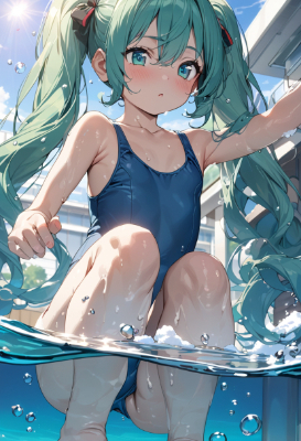 masterpiece, best quality, extremely detailed, anime, girl, masterpiece, best quality, extremely detailed, anime, girl, , Hatsune Miku in a blue-green twintails, playing in the water in a school swimsuit, child, soap bubbles, blue sky, sunlight, summer,longhair,blue hair,green hair,blue eyes,green eyes,odd eye,colored contact lenses