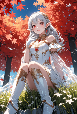 8K,((masterpiece,best quality,Ultra extremely detailed,perfect anatomy,detailed,high-resolution,highres,extremely detailed)),((close-up chest from below,Flowers print,child elf wearing glossy jewelry decoration red thin-cloth-suit with sparkle reflected light, sitting,wearing white-sox, see-through sleeves,see-through white gloves, see-through white boots,colored contact lenses )),looking at viewer, red Eyes, Reflections reflect strong highlight in eyes,waving shining long white hair_with curly,red Eye,elf ear with big earrings,opened_mouth:1.5,smile,blush,lipstick,full fresh lips,wet_lip,big hip,small breasts,BREAK,4K,great princess throne,plaza in grasses,many maple leaves,maple tree,dark clouds sunrise,birds,<lora:hairdetailer:1> <lora:make25d_type1_v100:1>,,