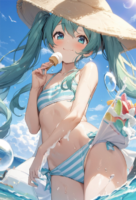 masterpiece, best quality, extremely detailed, anime, girl, ,ice,Hatsune Miku, VOCALOID, girl, blue-green twin-tail, girl in a striped bikini swimsuit with a cute smile eating ice cream on a beach in Tokonatsu Island. Clear blue seas and clear blue skies. There are Nyudo clouds floating in the sky. beach umbrella, soap bubbles, solar sunshine, summer, child,blue eyes,twintail,longhair,blue hair,green hair,my child
