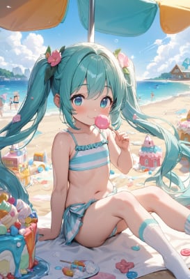masterpiece, best quality, extremely detailed, anime, girl, ,Hatsune Miku, VOCALOID, girl, blue-green twin-tail, girl in a striped bikini swimsuit with a cute smile eating ice cream on a beach in Tokonatsu Island. Clear blue seas and clear blue skies. There are Nyudo clouds floating in the sky. beach umbrellas, soap bubbles, solar sunshine, summer, beautiful girl,twintail,longhair,blue eyes,blue hair,green hair,clear sky,blue sky