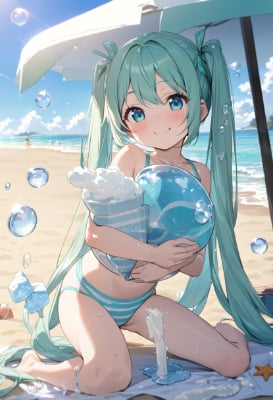 masterpiece, best quality, extremely detailed, anime, girl, ,masterpiece, best quality, extremely detailed, anime, girl, ,ice,Hatsune Miku, VOCALOID, girl, blue-green twin-tail, girl in a striped bikini swimsuit with a cute smile eating ice cream on a beach in Tokonatsu Island. Clear blue seas and clear blue skies. There are Nyudo clouds floating in the sky. beach umbrella, soap bubbles, solar sunshine, summer, child,blue eyes,twintail,longhair,blue hair,green hair,my child