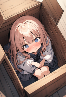 1girl, anime-style, young woman sitting inside a large, open wooden box, her expression is shy yet playful, with her knees drawn up slightly and her hands resting on the edge of the box, dressed in a simple, soft outfit that emphasizes her innocence, background is softly blurred to focus on her and the box, the atmosphere is warm and charming, masterpiece, best quality, highly detailed, ultra-detailed, sharp focus, refined details, high resolution, (sitting in a box:1.6), (playful and shy expression:1.5), (wooden box:1.4)