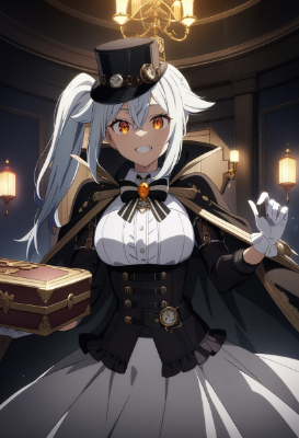 1woman, solo, 20yo, medium breasts, pirate, pirate hat, white blouse, cleavage, crimson trench coat, crimson corset, black mini skirt, belt, beautiful detailed face and eyes, amazed, crimson hair, medium hair, hair between eyes, blue eyes, open mouth, on one knee, cave, treasure box,(fantasy:1.3), anime artwork, anime style, key visual, vibrant, studio anime, masterpiece, best quality