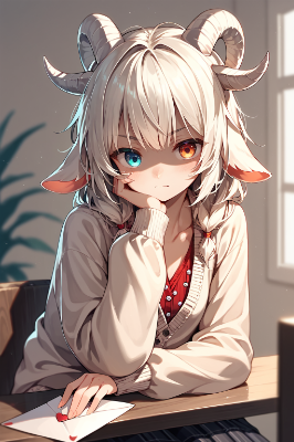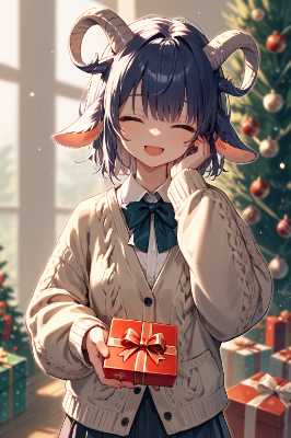 score_9,score_8_up,score_7_up,1girl,(beaded embroidery cardigan),outdoor,(goat horn),(peplum skirt),(horizontal pupils),(gift box in hand),closed eyes,happy,(shaded face),(blood on gift box),