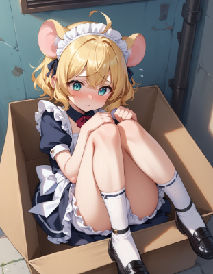 score_9,score_8_up,score_7_up,source_anime BREAK back alley,1girl,mouse ears,loli,petite,yellow hair,short hair,wavy hair,ahoge,aqua eyes,flat chest,(maid:1.2),(bloomers:1.1),over-kneehighs,sitting,legs_over_head,(flustered:1.5),(in the box:1.3),(knees_to_chest:1.4),leg_grab,