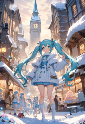 masterpiece, best quality, extremely detailed, anime, girl, skirt,masterpiece, best quality, extremely detailed, anime, girl, skirt, Hatsune Miku, Vocaloid, Light Blue Twin Tails, Blue Eyes, Snow Miku, Snowy Town, Clock Tower, Pale White Fluffy Coat, Snow Crystals, twintail, long hair, blue eyes, socks, fairy, fantasy, snow, city, winter, Candy house, big cake, candy flower field,box,glass