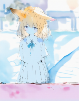 1girl, [satono diamond \(umamusume\)::1],[fox ears,Medium hair:2],upper body,[blonde hair:3:15],[(watercolor painting:1.0):5],[(sketch:1.2):5],[(unfinished:1.2):15],[preteen female,dainty body type:1],[masterpiece, best quality:1],pleated skirt,[isolated subject,distinct outline::3],[neck ribbon:1],[(outdoors,blurry background:0.9):1],[aged down:1:10],[action::1],[ sunken body,slender :1]