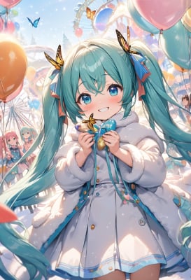 masterpiece, best quality, extremely detailed, anime, girl, skirt,masterpiece, best quality, extremely detailed, anime, girl, skirt,Hatsune Miku, Vocaloid, girl, blue-green twin tails, blue eyes, kaleidoscope, mirror room, colorful, sparkling,twintail,longhair,blue hair,green hair,glass,butterfly,my child,smile,smile,Kids