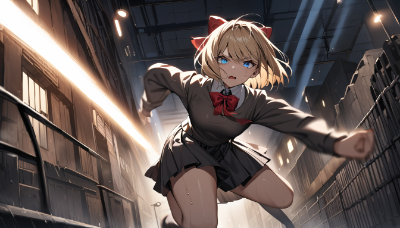 2 girls,duo,anime style,blond hair,short hair,blue eyes,(hair bow:1.4),red bow,black hair,black eyes,hairband,(sitting, in a canoe:1.4),amazon river,detailed forest background,lush green trees,dense foliage,river,fish swimming,crocodiles,tropical atmosphere,flowing water,wide river,both girls looking down,gazing at water surface,awe,wonder,serene expression,detailed facial expression,light breeze,wind ripples on water,sunlight filtering through trees,(masterpiece:1.2),best quality,very aesthetic,absurdres,