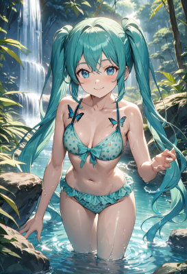 masterpiece, best quality, extremely detailed, anime, girl, twintail, longhair, blue hair, green hair, blue eyes, Amazon, butterfly, fantasy, Hatsune Miku, VOCALOID, blue-green twintails, blue eyes, girl in polka dot bikini playing in a river in the jungle. Smile, jungle, waterfall, stream, child, kid