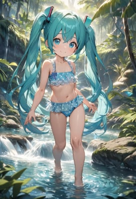 masterpiece, best quality, extremely detailed, anime, girl, twintail, longhair, blue hair, green hair, blue eyes, Amazon, butterfly, fantasy, Hatsune Miku, VOCALOID, blue-green twintails, blue eyes, girl in polka dot bikini playing in river in the jungle, smiling, jungle, waterfall, clear stream, child, transparent water