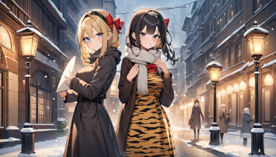 2girls,blonde hair,black hair,blue eyes,black eyes,(hair bow:1.4),red bow,black headband,(winter clothing:1.2),tiger print dress,pleated skirt,long sleeves,holding sign,smiling,shivering,(cold atmosphere:1.3),city street background,(lamp posts:1.1),bare trees,snow flurry,(light snowfall:1.2),overcast sky,(detailed background:1.2),side blunt bangs,hairs between eyes,medium breasts,gentle expression,(joyful expression:1.1),(confident pose:1.1),(masterpiece:1.4),(best quality:1.4),very aesthetic,(absurdres:1.3),