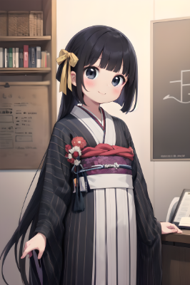 1 girl,(((very longest hair))),black hair, ,straight Hair,hair ribbon,mintgreen stripe,Black Eyes,flat chest,straight Across bangs,princess Cut, Very Long Sideburn,roundry Head,Droping eyes,cute,Meekness,Bob Cut,long back hair,12 years Old,kimono,smile,rays of light