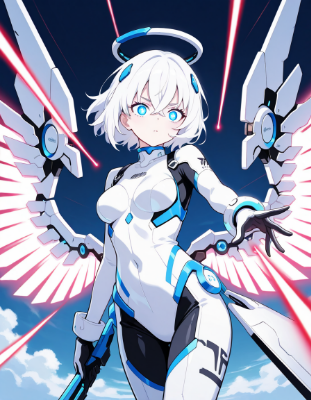 best quality,highly detailed,high resolution,1girl,white hair,short hair,blue eyes,crossed bangs,agent,mechanical_halo,white body suit,glowing eyes,constricted_pupils,mechanical wing,pose,(beam:1.2),(laser:1.2),spread_fingers,