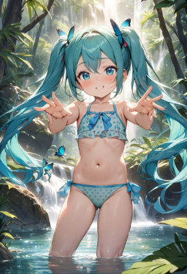masterpiece, best quality, extremely detailed, anime, girl, ,masterpiece, best quality, extremely detailed, anime, girl, twintail, longhair, blue hair, green hair, blue eyes, Amazon, butterfly, fantasy, Hatsune Miku, VOCALOID, blue-green twintails, blue eyes, girl in polka dot bikini playing in a river in the jungle. Smile, jungle, waterfall, stream, child, kid,smile,magic,make a heart with your hands,rays of light,my child