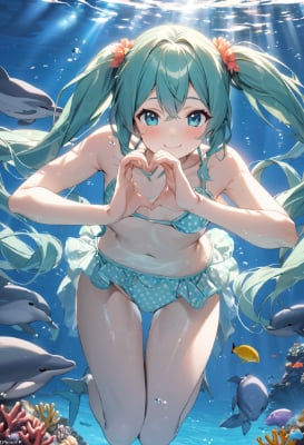masterpiece, best quality, extremely detailed, anime, girl, ,masterpiece, best quality, extremely detailed, anime, girl, twintail, longhair, blue hair, green hair, blue eyes, Amazon, butterfly, fantasy, Hatsune Miku, VOCALOID, blue-green twintails, blue eyes, girl in polka dot bikini playing in a river in the jungle. Smile, jungle, waterfall, stream, child, kid,smile,magic,make a heart with your hands,rays of light,my child