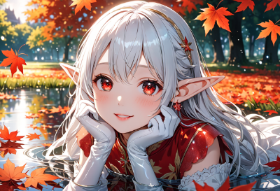 8K,((masterpiece,best quality,Ultra extremely detailed,perfect anatomy,detailed,high-resolution,highres,extremely detailed)),((close-up eye,Flowers print,child elf wearing glossy jewelry decoration red thin-cloth-suit with sparkle reflected light, cute posing,wearing white-sox, see-through sleeves,see-through white gloves, see-through white boots)),looking at viewer, red Eyes, Reflections reflect strong highlight in eyes,waving shining long white hair_with curly,elf ear with big earrings,opened_mouth:1.5,smile,blush,lipstick,full fresh lips,wet_lip,big hip,small breasts,BREAK,4K,((many rays_of_light)),((lightning_beems)),plaza in grasses,many maple leaves,maple tree,dark clouds sunrise,birds,<lora:hairdetailer:1> <lora:make25d_type1_v100:1>,,