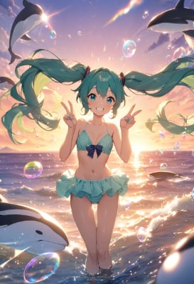 masterpiece, best quality, extremely detailed, anime, girl, Hatsune Miku, VOCALOID, blue-green twintails, jungle, girl in tiger print bikini riding a tiger, water, waterfall, deep jungle, sanctuary, beautiful girl, fantasy, water splash, sunlight filtering through.