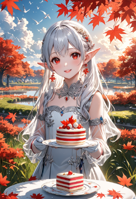 8K,((masterpiece,best quality,Ultra extremely detailed,perfect anatomy,detailed,high-resolution,highres,extremely detailed)),((Close-head,Flowers print,child elf wearing glossy jewelry decoration red striped thin-cloth-suit with sparkle reflected light, wearing white-sox, see-through sleeves,see-through white gloves, see-through white boots)),looking at viewer, red Eyes, Reflections reflect strong highlight in eyes,waving shining long white hair_with curly,elf ear with big earrings,opened_mouth:1.5,smile,blush,lipstick,full fresh lips,wet_lip,big hip,small breasts,holding short_cake,BREAK,4K,((SWEETS PARADISE)),tea-set on round table,many deserts,plaza in grasses,many maple leaves,maple tree,dark clouds sunrise,birds,<lora:hairdetailer:1> <lora:make25d_type1_v100:1>,,