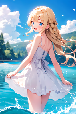 (masterpiece)(best quality)(ultra detailed)(high resolution),1girl, solo, blonde hair long hair wave hair, side braid, blue eyes, glamorous, petite, smile, open mouth, navy white sweater off shoulder sweater dress, lying on the bed, looking at viewer, indoors private room