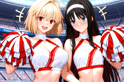 暑い中応援するチアリーダーのアルクェイドと秋葉! アルクェイド「暑い中皆さん、お疲れ様~!」 アルクェイドの胸を羨ましそうに見つめる秋葉 秋葉「うわ...私の胸、小さすぎ…?」 Cheerleaders Arcueid and Akiha cheering in the heat! Arcueid “Thank you all for your hard work in the heat~!” Akiha gazing enviously at Arcueid\'s chest Akiha: “Wow... My breasts are too small...?”