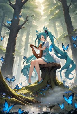 masterpiece, best quality, extremely detailed, anime, girl, skirt, Hatsune Miku, VOCALOID, blue-green long twin tail, fairy girl sitting on a stump, playing a harp with a smile, fantastic forest with mossy trees, deep thick fog, little blue birds, blue butterflies, wolf, mushrooms, fog