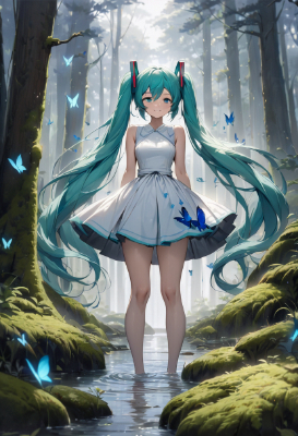masterpiece, best quality, extremely detailed, anime, girl, skirt, misty forest, Hatsune Miku, VOCALOID, girl, blue-green long twintails, skirt, serene smile, white dress, moss-covered trees in a fantastical deep forest shrouded in thick mist, flowing stream in the forest, blue butterflies, mystical, mist