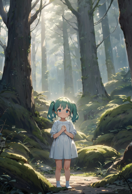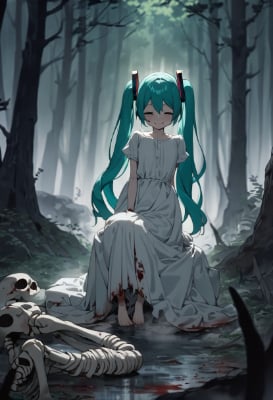 masterpiece, best quality, extremely detailed, anime, girl, skirt, misty forest, Hatsune Miku, VOCALOID, long twintails in blue-green, dark and dim forest with thick mist, girl in a blood-stained white dress, cute innocent smile, skeleton at her feet, dark fantasy, horror