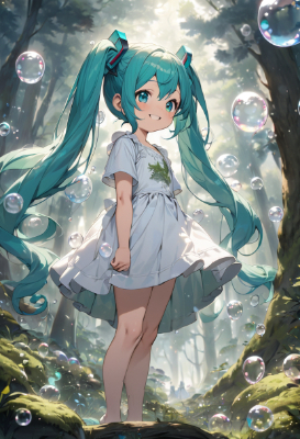 Hatsune Miku, VOCALOID, blue-green long twin tail, girl, skirt, fairy girl who sits on a stump and plays a harp with a smile in a fantastic forest with mossy trees standing deep and thick fog. Right next to it, a white wolf is relaxing. fog, forest, moss, wolf, fantastic