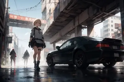 1girl posing next to car, solo, (black serafuku):1.4, (flowing hair, blonde short hair), work gloves, tool belt, <lora:zeekars:0.65>, <lora:Silicon-landscape-isolation:1>
