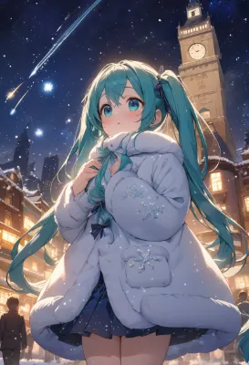 masterpiece, best quality, extremely detailed, anime, girl, skirt, Hatsune Miku, VOCALOID, blue green long twin tail, starry night, looking up at the starry sky, night town, fantastic night, powdery snow, snowflakes, shooting stars, starry sky, 星降る夜, city, fluffy coat, snowing, winter, clock tower