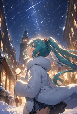 masterpiece, best quality, extremely detailed, anime, girl, skirt, Hatsune Miku, VOCALOID, blue green long twin tail, starry night, looking up at the starry sky, night town, powdery snow, snowflakes, shooting stars, starry sky, starry night, fluffy coat, city, snowing, winter, clock tower,冬の花火